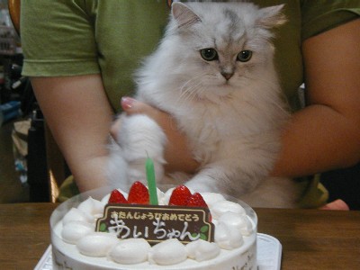 ケーキに近づけて撮った写真。 なかなかお座りしないので、私が抱っこした。 ドコ向いてるんだよ、あいちゃん(*´∀`)ゲラゲラ 微妙に怒ってます。写真しつこく撮ろうとしてごめんねー。