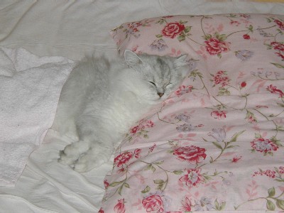 誕生日から1日経った写真。 相変わらずベットで爆睡しています(笑) ちゃんと枕を枕として使って(ノ゜凵K)ノびっくり!! タオルをかけてあげてみました。人間っぽいぞ!!あいちゃん。 たまたま私の枕がピンクの花柄だったからちょっと豪華な感じです(笑)