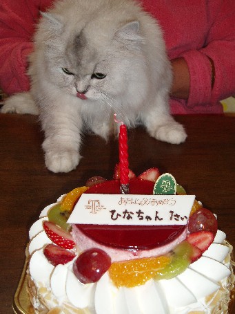 ひなちゃん誕生日ケーキを見て舌なめずりしてます。